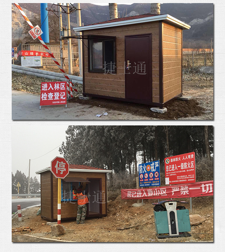 為了加強森林防火檢查站的管理,充分發(fā)揮檢查站的智能作用,結(jié)合每個地區(qū)的情況,制定不同的崗亭方案。檢查站崗亭的工作人員要嚴格對進入林區(qū)的人員、車輛實施檢查和教育。扣留火種并對人員、車輛做好登記工作。天津市捷士通科技有限公司是一家專業(yè)設(shè)計、加工、生產(chǎn)各類成品崗亭的綜合移動房屋銷售的制造商。公司可定制崗亭、不銹鋼崗亭、收費崗亭、保安崗亭、售貨亭、奶茶崗亭、售貨車、售票亭、鋼結(jié)構(gòu)、活動房、早餐亭、報刊亭、環(huán)衛(wèi)房等。