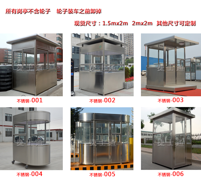 方形不銹鋼崗亭:1.2*1.2、1.2*1.5、1.5*1.5、1.5*2、2*2、2.*2.5、2.5*2.5、2*3 等尺寸,都是可以定做,捷士通崗亭廠家有現(xiàn)貨供應