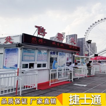 標(biāo)準(zhǔn)配置:墻體含保溫材料,屋頂鍍鋅板靜電噴涂,PVC吊頂,室內(nèi)地板可定做防滑鋁板,電箱、開關(guān)、插座、暗敷電線、照明燈、桌面、抽屜、鍵盤托、空調(diào)架等。推拉窗多個窗口,方便與游客溝通。