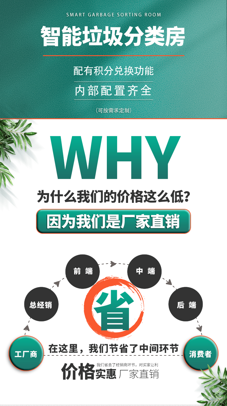 垃圾分類房系列產(chǎn)品外觀整潔大氣,高端時(shí)尚,可融入周邊建筑群體,并可為垃圾分類引導(dǎo)員提供休息執(zhí)勤的空間,房屋內(nèi)部設(shè)備配套齊全,可有效解決氣味污染、環(huán)境視覺污染等問題。垃圾分類房的設(shè)置可以減少垃圾處理量和處理設(shè)備,降低處理成本,減少土地資源的消耗,具有社會(huì)、經(jīng)濟(jì)、生態(tài)等幾方面的效益,在垃圾分類工作中發(fā)揮了不可替代的作用。我公司致力于垃圾分類房的整體解決研發(fā)設(shè)計(jì),擁有強(qiáng)大的研發(fā)團(tuán)隊(duì)、設(shè)計(jì)團(tuán)隊(duì)、銷售管理團(tuán)隊(duì)以及自動(dòng)化流水線式的生產(chǎn)車間,致力于開拓全國、服務(wù)全國,打造全國先進(jìn)的垃圾分類房生產(chǎn)廠家。